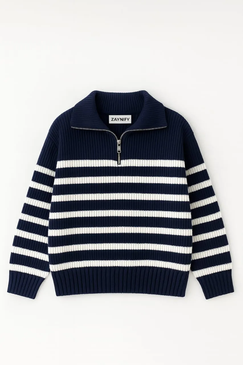 Timeless navy meets classic white in this Half Zip Stripe Sweater — a must-have for a polished, minimal wardrobe. Knitted from 3-ply acrylic yarn, it delivers a structured yet soft feel. The half-zip collar adds a sporty edge, making it perfect for both casual and smart layering.